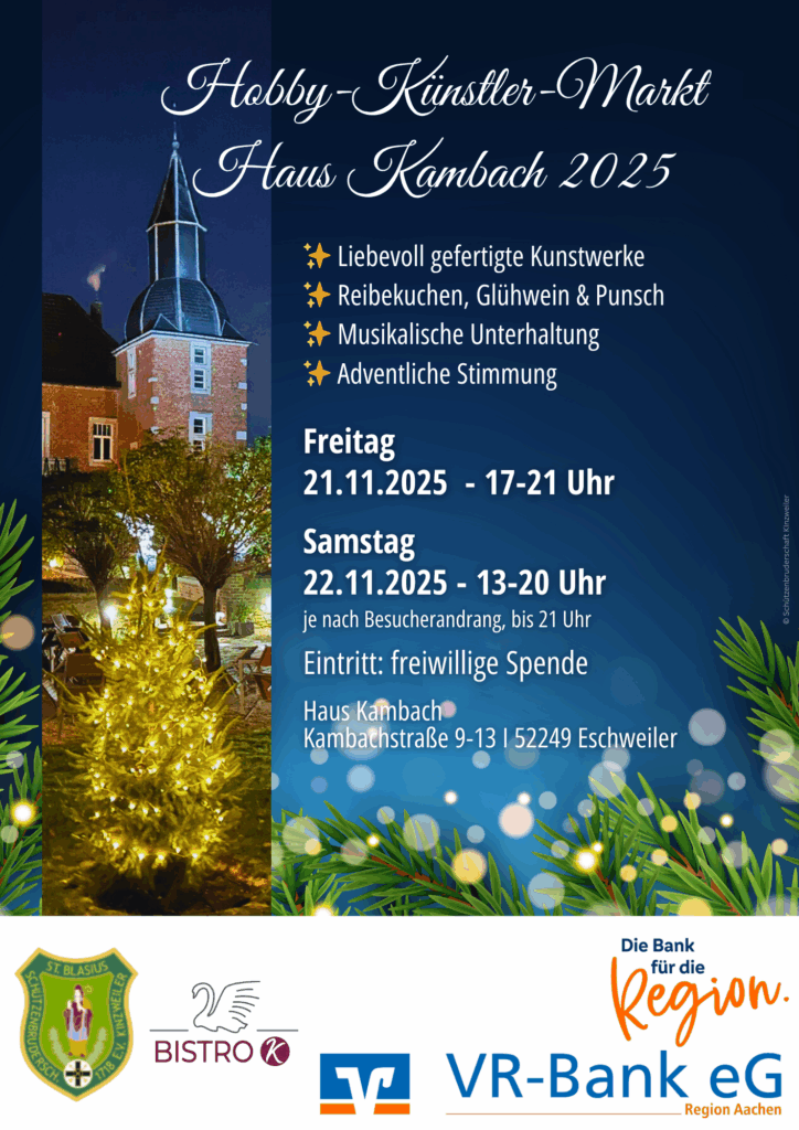 Eschweiler – Am Freitag, den 21. November, und Samstag, den 22. November 2025, öffnet das traditionsreiche Haus Kambach wieder seine Tore zum beliebten Hobby- & Künstlermarkt. Nach dem großen Erfolg der vergangenen Jahre dürfen sich Besucherinnen und Besucher erneut auf ein stimmungsvolles Wochenende voller Kreativität, Handwerkskunst und kulinarischer Genüsse freuen.
